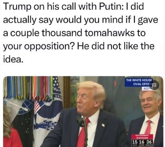 果然,普京说了那句话之后,川普变脸了。他在记者会上说:“美国也需要战斧导弹——我们有很多,但我们需要它们。我们不能为了(别的)国家而耗尽它们……我不知道我们能做些什么。”