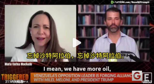 诺贝尔盒瓶奖得主马查多建议川普夺取委内瑞拉的石油并推翻马杜罗政权:“忘掉沙特阿拉伯——我们有更多的石油;我们将全部私有化并交给美国公司。”