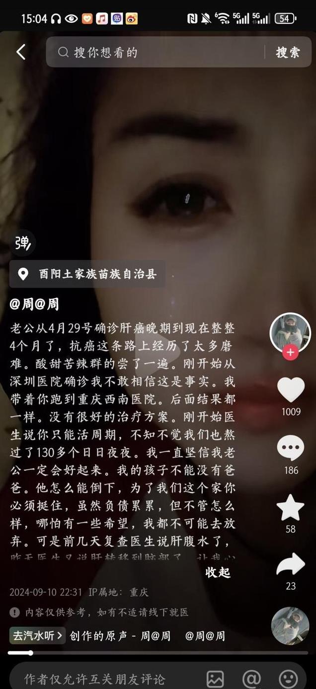 大概当时她的丈夫身体就出了问题,5月9日,小周发了视频,视频中,她忍不住流泪,她在视频文案中说,不要抱怨生活,走进医院,会看到不一样的世界,在健康面前,一切都微不足道,不过这时的小周,并没有说自己丈夫是被检查出了肝癌。