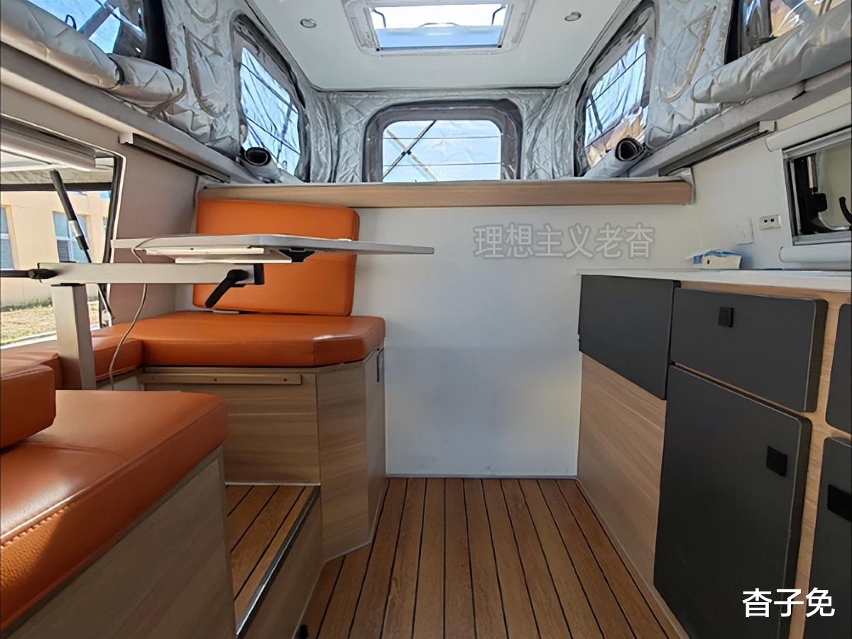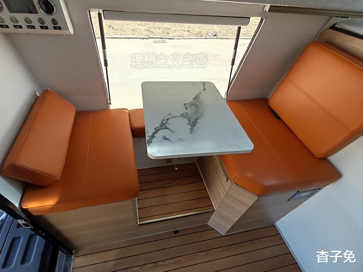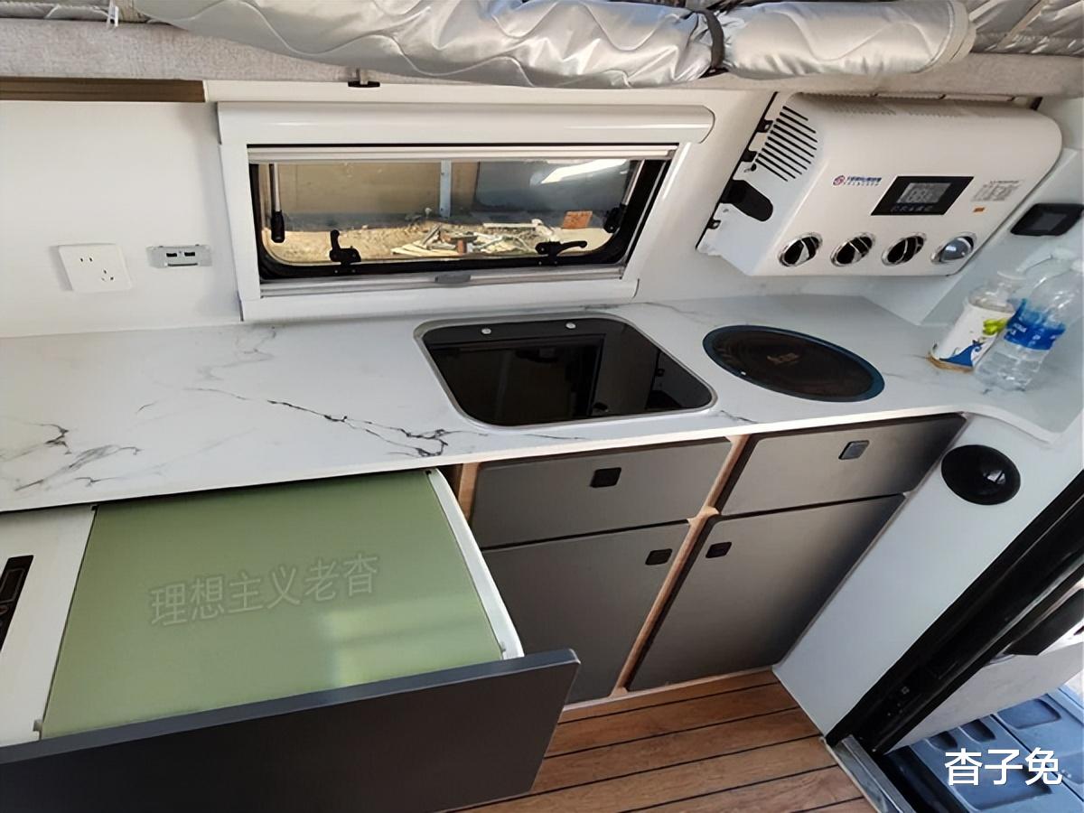 右侧是车载小厨房,下面有水有电有炊具,上面有洗菜池和电磁炉,车内做饭很方便。