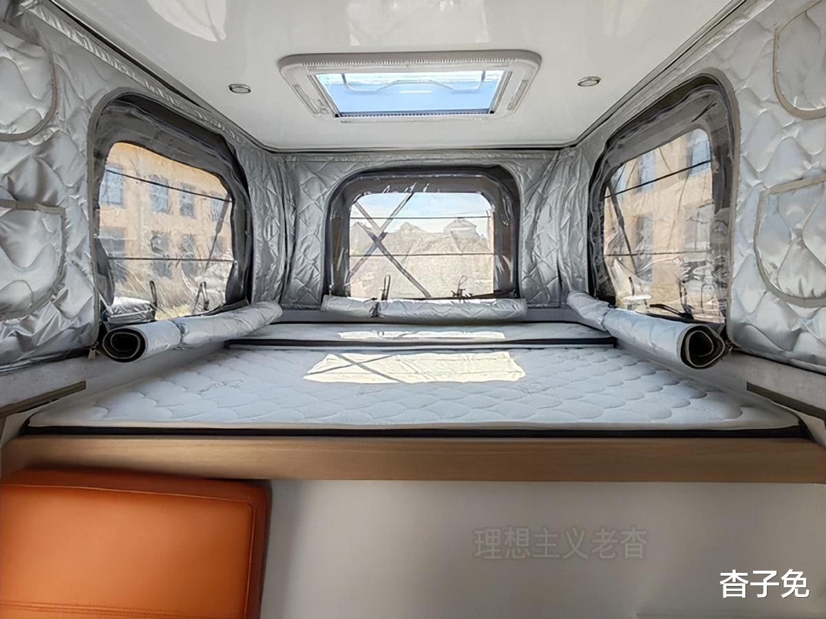 这是一台双排皮卡车,采用背驮房箱模式组合成房车,房箱软升顶设计,顶部和左右两侧都开设了房窗,箱门在车尾是通用布局,270度侧尾帐更有利于户外露营。