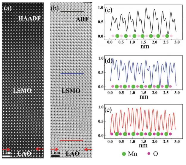 图9:用离子液体的顶栅对 La0.8Sr0.2MnO3/LaAlO3抽氧之后的 STEM图像。(a)高角环形暗场像(High Angle Annular Dark Field,HAADF);(b)ABF 像;(c)、(d)、(e)分别为离表面不同距离的黑、蓝、红线位置的MnOx层的Mn 原子和O原子的强度图。研究人员构筑用离子液体作为栅极的La0.8Sr0.2MnO3/LaAlO3场效应结构,用环形明场像观察了 La0.8Sr0.2MnO3薄膜中氧空位的分布。由于外加电场作用下离子液体中残余水的分解使薄膜中产生了氧空位,ABF 的结果显示,La0.8Sr0.2MnO3 薄膜中越接近表面的氧空位浓度越高,如图9所示。但实际上 ABF 并不适合直接测量氧空位。因为 ABF 是相干衬度,对厚度、表面污染、应力等都比较敏感,很难确定原子柱强度变化是否是由空位产生的。