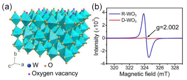 图7:(a)WO3 中氧空位分布的示意图;(b)室温下含有氧空位(蓝线)和不含氧空位(红线)的 WO3 的电子顺磁共振谱。研究人员通过在氮气气氛中烧结得到了富含氧空位的 WO3 样品,并证明该样品超过 80% 的光催化效率。然后利用电子顺磁共振,发现富含氧空位的 WO3 表现出明显对称的 g 值为 2 的电子顺磁共振信号,这是含有氧空位的特征,如图7所示。因此,电子顺磁共振是判断材料中是否存在氧空位最为直接有效的手段。DOI:10.1021/jacs.6b04629