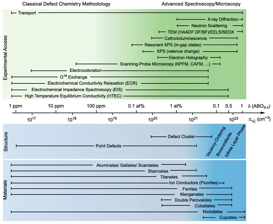 图2:可用于探测不同数量级氧空位浓度(绿色)和不同材料体系中空位发生的实验方法(蓝色)。DOI:10.1063/1.5143309