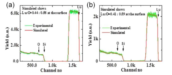 图8:卢瑟福背散射技术定量地确定生长得到的 Lu2O3 样品(a)和在氧气中退火之后样品(b)中的氧空位含量。研究人员应用该方法定量地确定了生长在 Si 衬底上 Lu2O3 薄膜中的氧空位。如图8所示的卢瑟福背散射谱,可以清楚看到 Si、O 和 Lu 边,并且可以测得生长得到的 Lu2O3 薄膜的 Lu、O 的比例为 0.44:0.56,说明薄膜中存在氧空位。而经过氧气中退火,元素比例变为 0.41:0.59(接近理想的 Lu2O3 薄膜的 0.40:0.60),这表明氧空位含量的降低。DOI:10.1039/c6ra22391e