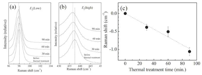 图4:ZnO 粉末在氢气中 400℃ 退火不同时间的拉曼谱的 E2 低频(a)和高频(b)模式的变化;(c)高频模式的拉曼位移随着退火时间变化的关系。研究人员通过在 300℃-600℃ 的氢气中还原 ZnO 粉末,利用拉曼光谱定量研究了 ZnO 粉末中的氧空位。他们发现随着还原温度的提高,一支与氧离子振动相关的峰逐渐向低频方向移动。而经过重新氧化,这个峰又恢复到了初始的位置。由于该峰的位移量随着氧空位含量的增加而变大,所以可以据此大概估算样品中氧空位的含量(图4)。DOI: