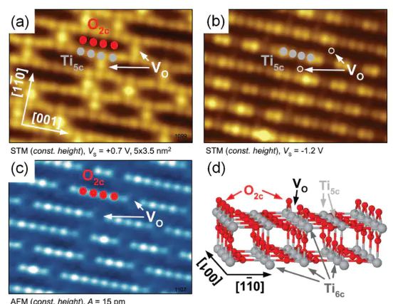 图10:金红石相的TiO2(110)表面的 STM/AFM的图像(a)空态(表面氧空位)的 STM图;(b)填充态(氧原子)的 STM图;(c)相应的AFM图,测试温度为 78K;(d)TiO2(110)表面的结构模型。研究人员借助 STM/AFM 对金红石相的 TiO2 表面的氧空位进行研究。在大多数金属氧化物的 STM 图像中由于氧原子的电子态很少能够接近费米能级,所以图像中显示的通常是金属阳离子的位置。而氧空位能够提供额外的两个电子局域在空位上,所以在氧离子列上的亮点为氧空位的位点。而 AFM 的另外一个优势是它对金属氧化物样品中晶格上的氧离子非常敏感,因此可以直接对表面的氧离子进行探测。DOI:10.1039/c7cs00076f