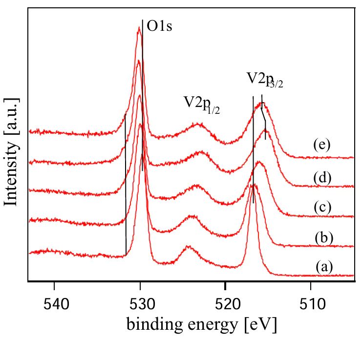 图3:在超高真空中不同温度下退火 V2O5 薄膜,其 O 1s 和 V 2p 芯能级的X射线光电子能谱。(a)为加热之前,(b)-(e)分别为 200℃、300℃、400℃退火 1h 之后。研究人员利用 XPS 研究 V2O5 薄膜的热力学性质,发现 400℃ 下在真空中退火可以在薄膜中诱导出氧空位,从而逐渐还原 V2O5 薄膜。如图3所示,随着真空中退火温度的提高,V 的峰(2p3/2和 2p1/2)逐渐变宽,并向低结合能的方向移动,而 O 的峰(1s)逐渐向高结合能的方向移动,这表明了氧空位的增加以及 V 离子价态的降低。在缺氧的 CeO2-x、TiO2-x 以及 ZnO 等材料中也观察到了这种现象。DOI:10.1016/j.apsusc.2004.05.112