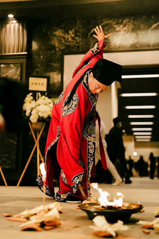 而中间的火盆代表了亡人生前的业障,喃呒师傅舞动白幡,抱着先人灵位,口中含清水喷向火盆,水雾与火盆中的油接触成油花,届时腾起大火,这时师傅一跃而过,寓意带着亡人脱离地狱火海,仪式完成。