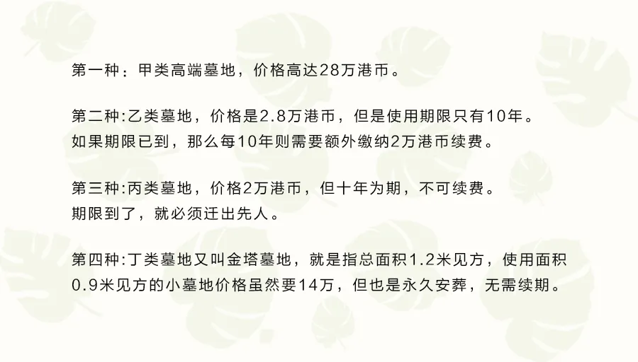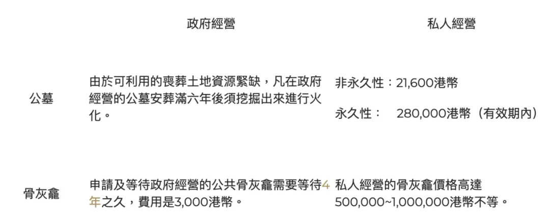 香港是一个活活不起,死死不起的神奇地方。香港跟内地很大的不同就是土地成本,不管是土葬还是火葬,在内地找个地方埋了不会成为家庭的负担,香港就不一样了。在香港土葬是一个极其奢侈的事情,仅就2019年的统计,香港永久墓地价格飙升至300万到500万港元,一些高端私营墓地价格甚至可以达到房价的3倍。根据香港墓地网的介绍,私营的墓地有四种如下: