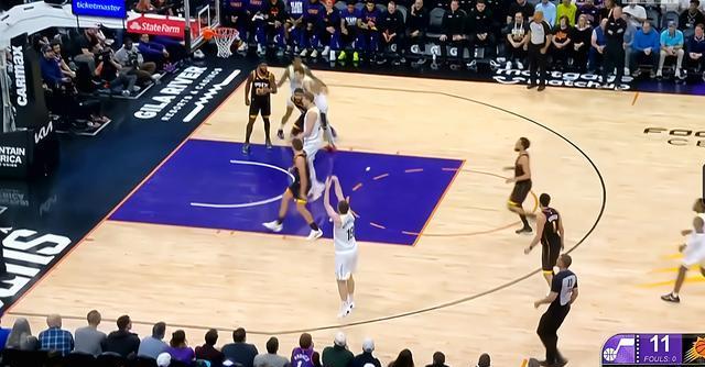 然而,比赛的悬念并没有就此消失。末节的太阳队一度看到了胜利的曙光,胜利似乎就在眼前,触手可及。可爵士队就像一支隐藏着强大力量的队伍,在最后时刻突然发力,反超了比分。就在这紧张到空气都仿佛凝固的时候,阿伦就像一位英雄降临,他的绝平三分就像一道闪电,划破了紧张的气氛,双方就这样进入了加时赛。在加时赛中,太阳队像是被彻底激发了斗志,他们不再给爵士队任何机会,仿佛一群饥饿的猛兽扑向猎物,最终太阳队成功地拿下了这场艰难的比赛。