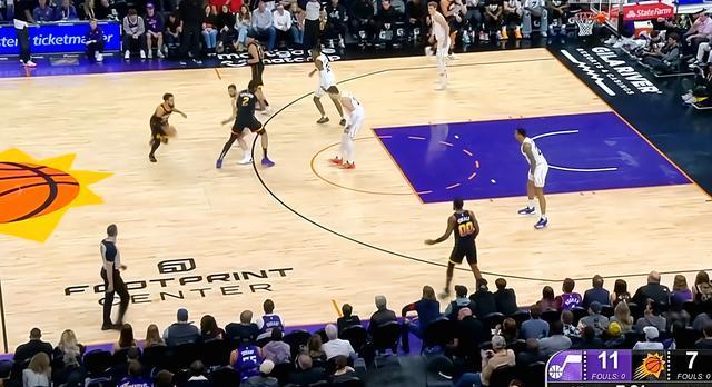 比赛的开场铃声一响,太阳队就像是陷入了泥沼。爵士队虽然在西部算是目前较为弱势的球队,但对于太阳队来说,这依然是一场硬仗。残阵的太阳队真是让人大跌眼镜,就像一个尚未完全准备好就上战场的士兵。布克登场时,三分球像是被施了魔法一般连续打铁,这可让球迷们的心都揪了起来。不过布克可不是轻易就会被打倒的人,他巧妙地通过突破和中距离投篮来为球队得分。格雷森·阿伦呢,开场就像一个还没睡醒的老熊,慢热得很,多次投篮未能命中。泰厄斯·琼斯的表现也如同一般般,毫无亮点。奥尼尔在攻守两端倒是努力地贡献着自己的力量,仿佛是黑暗中的一盏小灯。内线的理查兹面对马尔卡宁等人时,也显得有些吃力,像是一个小战士面对重重高山。值得一提的是,这一天爵士队大将马尔卡宁在进攻端可是非常强势,他就像一匹脱缰的野马,一上来就连得分。而且这一天爵士队两大后卫赛克斯顿与克拉克森都高挂免战牌,可他们在的内线却有着得天独厚的优势,第一节比赛打得那叫一个轻松自在。再看太阳队的防守,就像是一层薄薄的纸,完全不给对手强度,进攻端的首发球员状态也很平常,替补阵容更是让人不敢恭维。就这样,首节比赛结束,太阳队就像战败的一方,20 - 30落后爵士10分,这就像是一个沉重的包袱,压在了太阳队的心头。