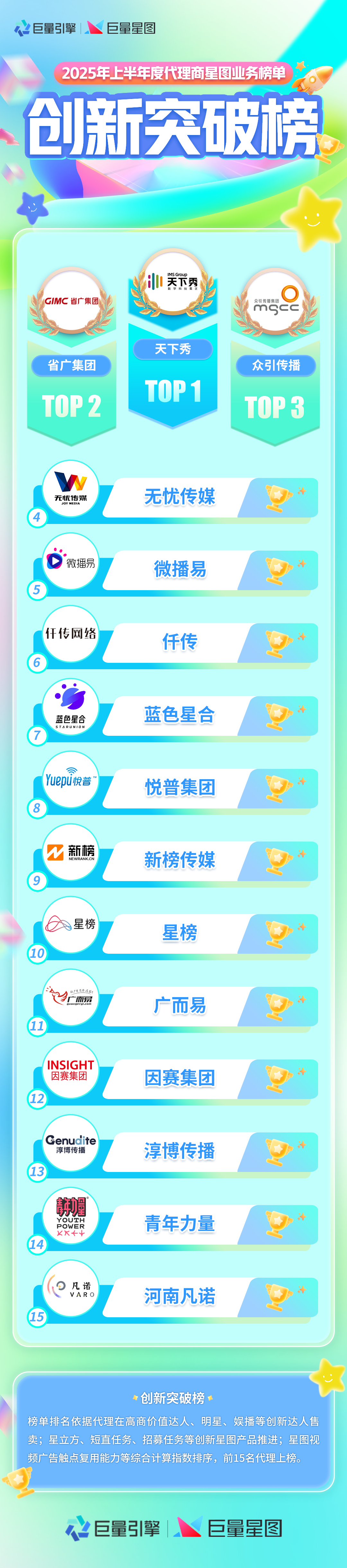 创新突破榜单致力于彰显星图代理商在星图创新业务推进中的卓越表现。从创新达人挖掘维度,体现代理商在达人资源拓展与运用的能力;从创新产品推进维度,体现代理商对创新产品的推广与应用能力;从星广高效融合维度,体现星图代理商多触点组合。上榜的代理商在创新业务领域勇于探索、积极实践,为星图创新业务的发展注入了强大动力,引领着业务发展的新方向。