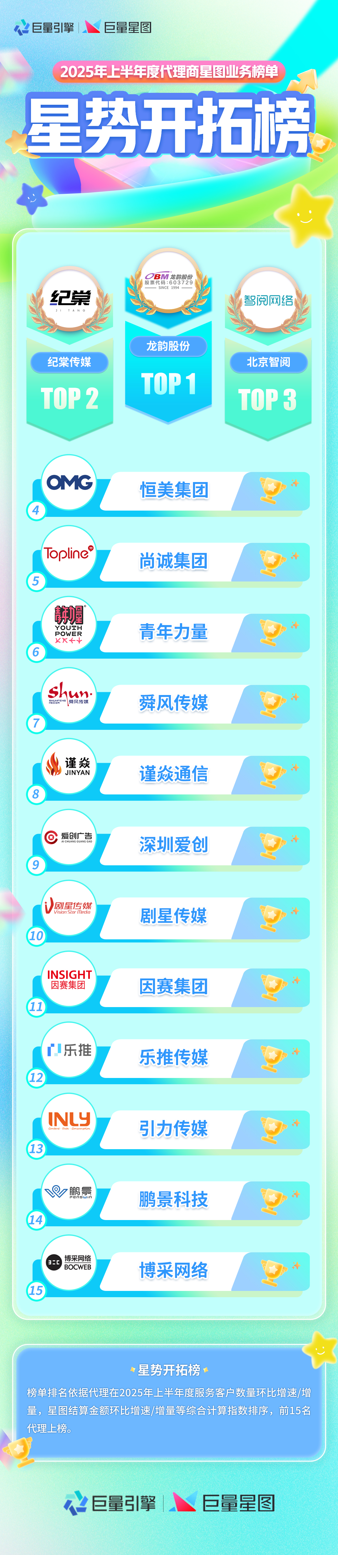 此次 2025 半年度巨量引擎代理商星图业务榜单的发布,不仅是对上榜代理商实力的肯定,更为市场提供了了解星图代理商的重要窗口。让我们共同期待这些优秀的代理商在未来创造更多精彩!