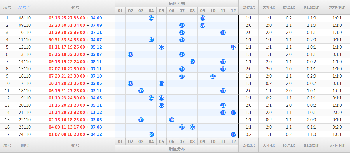 七、历史同期,后区开奖结果和走势图(历史数据演示):