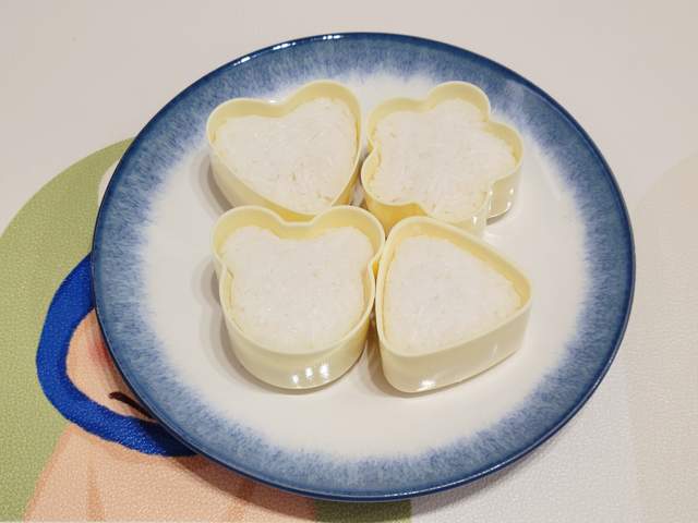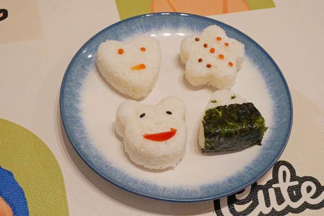 做饭团的方法超级简单,用电饭煲把米饭煮好,然后装入饭团模具中,按压脱模,再用一些海苔、番茄、芝麻等装饰就行,下图是我家娃自己动手做的饭团,算不上精美,但也可可爱爱的,而且他吃着自己做的饭团更有成就感~