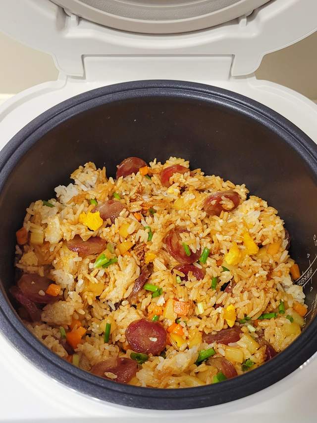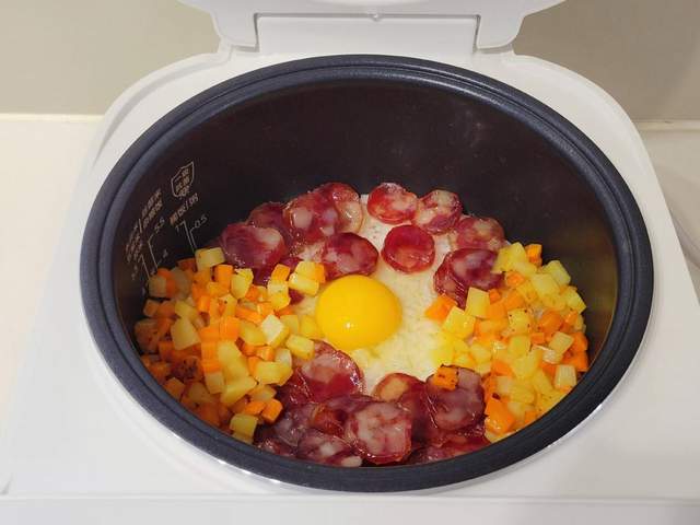 第二步,电饭煲选择【煲仔饭】模式,先煮40分钟,然后将香肠、土豆丁、胡萝卜丁和鸡蛋码在米饭上,接着再煮15分钟;