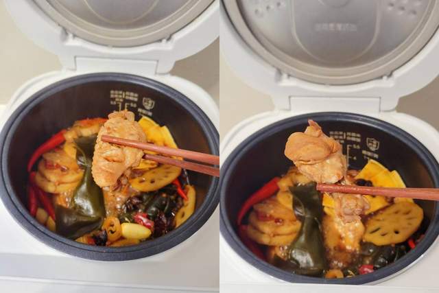 电饭煲上下内置两个NTC感温探头,能精准控温,让食材受热均匀,用美的白月光电饭煲炖出来的大鸡腿和鸡翅软糯有嚼劲,连素菜也吸满了酱汁,超级入味,好吃到根本停不下来,宅家追剧的必备搭子!