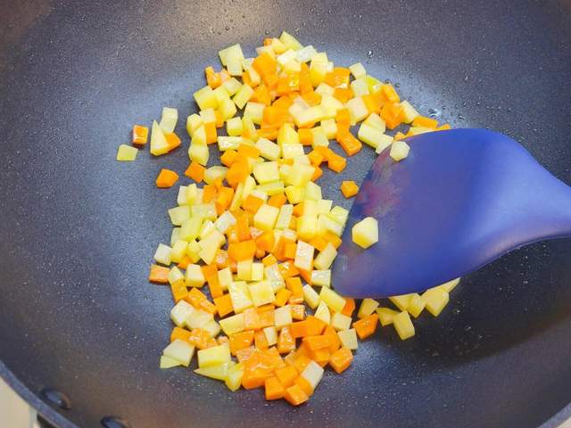 第一步,将土豆丁和胡萝卜丁倒进锅里翻炒一会;