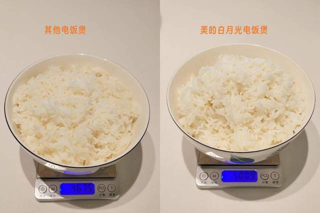 我把相同克重的水(300g)和米(250g)同时放进两个锅里煮,煮饭时间都是40分钟,然后把两个锅里的米饭全部盛到碗中,对其称重。同样的水米比,美的电饭煲煮好的米饭是500.9g,而其他的电饭煲则是467.5g。