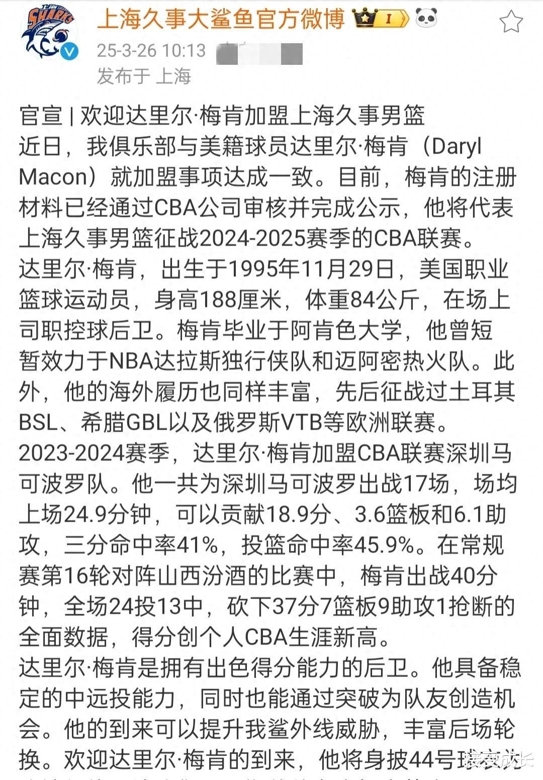 梅肯上赛季效力于深圳队,虽然出场时间不算特别长,场均24.9分钟,但他展现了不俗的得分能力和组织能力。18.9分3.6篮板6.1助攻的数据,以及41%的三分命中率,足以证明他的实力。对于急需提升进攻火力和组织进攻的上海队来说,梅肯的到来无疑是一针强心剂。然而,这支球队现在也面临着不小的挑战。
