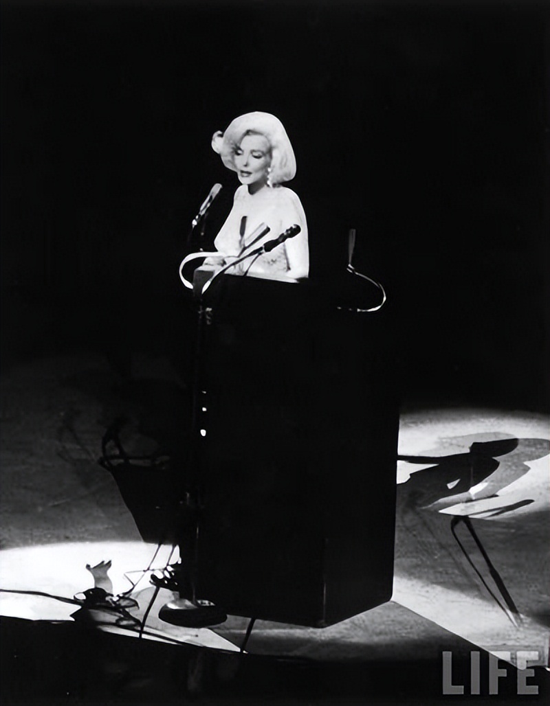 可被蒙在鼓里的观众,却在下一刻看到了一场人生中不可被遗忘的大戏:梦露走上台,妖娆地将大衣脱下,灯光之下,仿若没穿衣服的她闪闪发光。