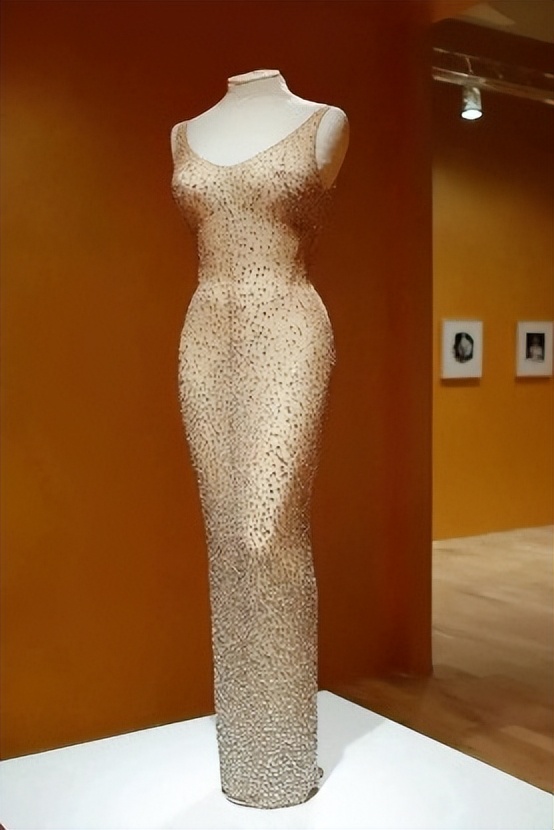 梦露的性感是她身上最重要的亮点,而这件礼服便采用相当暧昧的肉色薄纱打造,裙子上的钻石不是真的,可它闪耀无比,在灯光下格外耀眼。