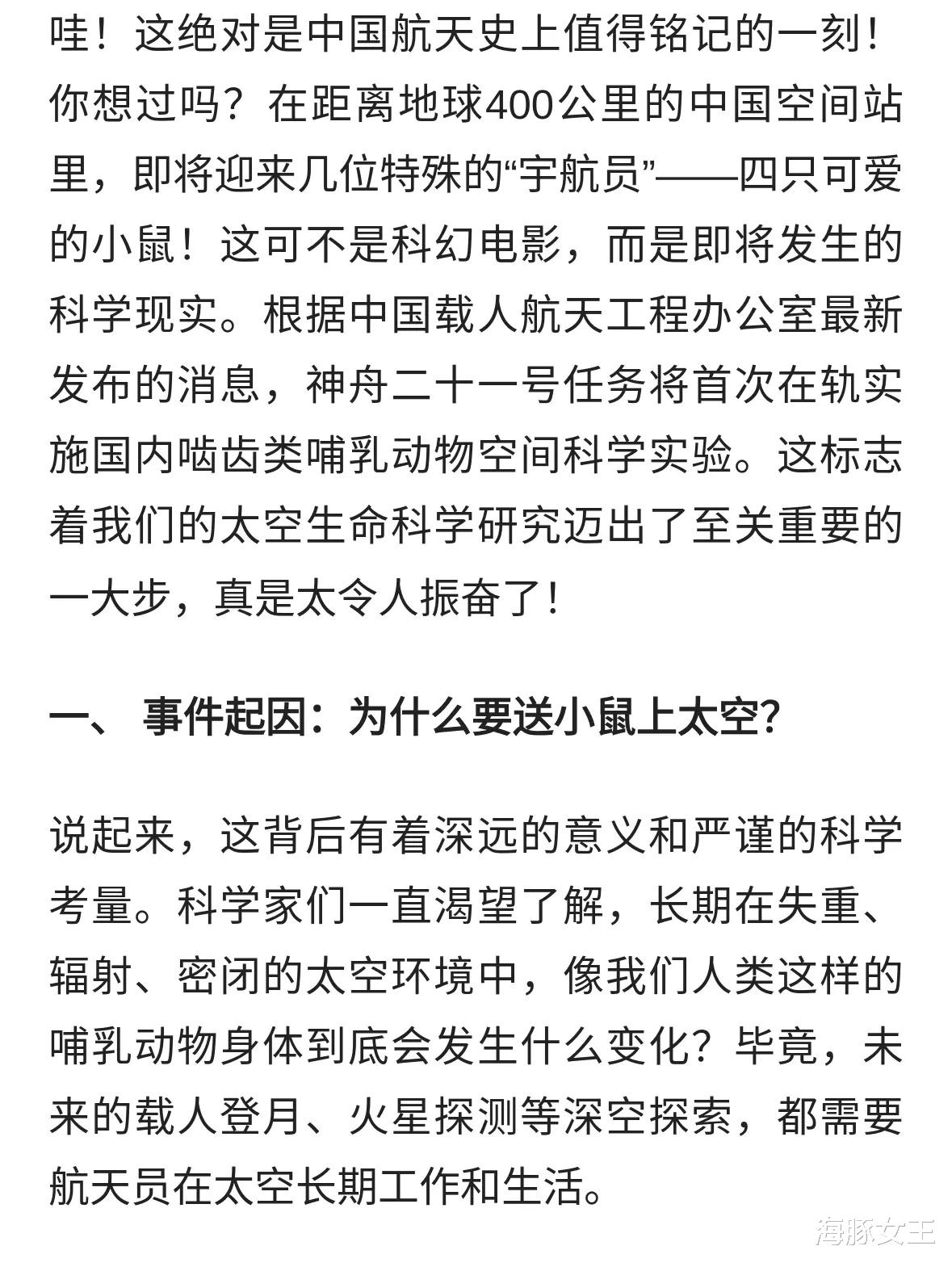 这次神舟二十一号也比较有看点,会有4只小鼠2公2母,跟随航天员前往太空进行科学实验。