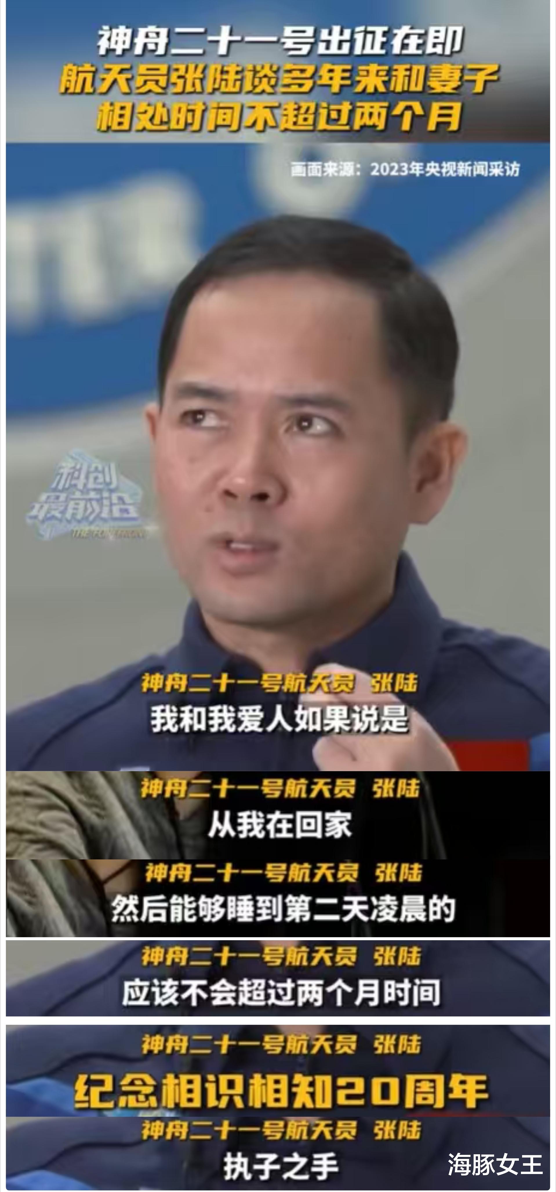 张陆作为航天员,平时忙于工作,和妻子程亮结婚22年,多年来和妻子相处时间不超过2个月。