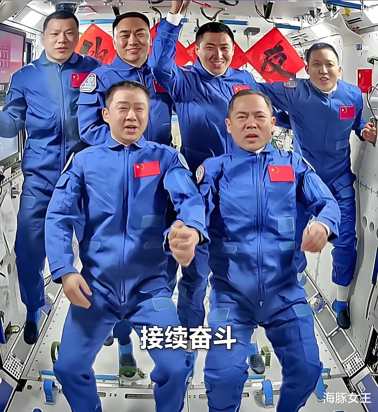 这也是中国航天史上第七次太空会师,神舟二十号和神舟二十一号,6名航天员在太空站拍下“全家福”。