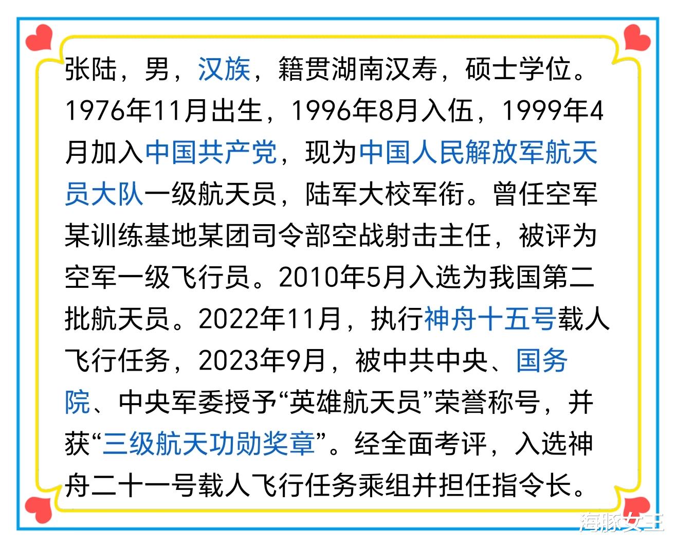 张陆是神舟二十一号载人飞行任务的指令长,这次的主要任务,是以指令长的身份,把更多的机会交给武飞和张洪章。