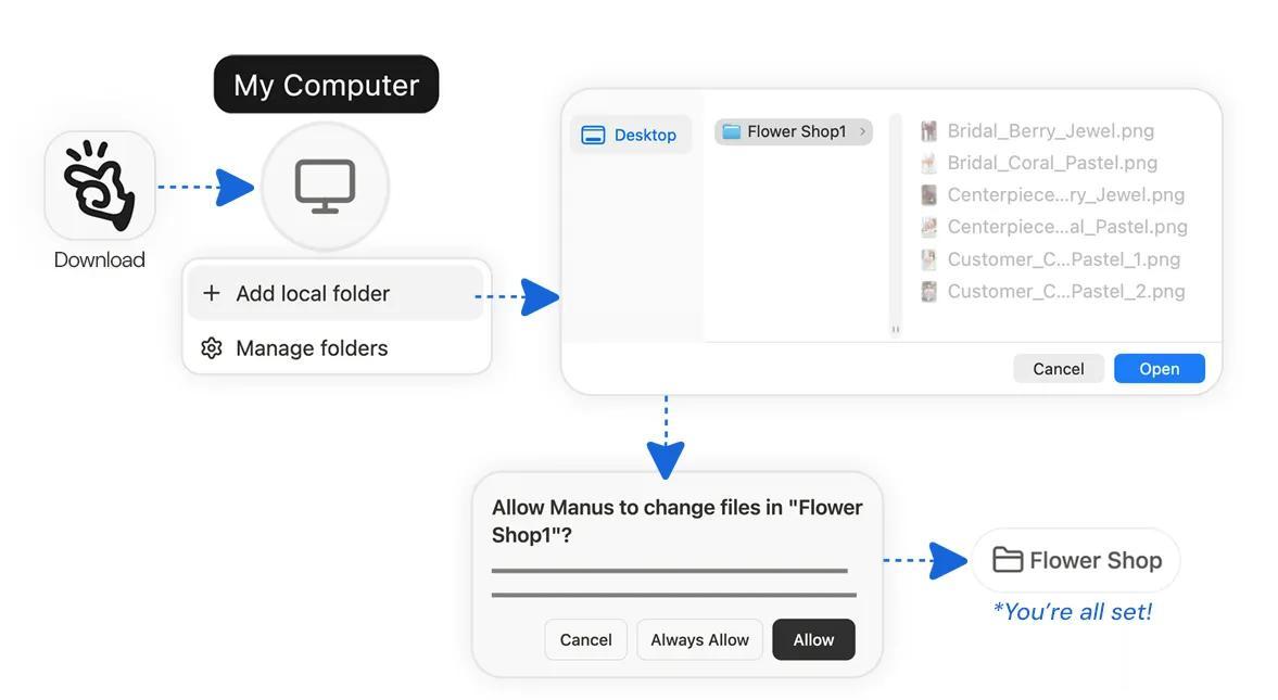 登录 Manus 账号点击 My Computer,并添加你希望 Manus 使用的本地文件夹选择并授权文件夹开始操作