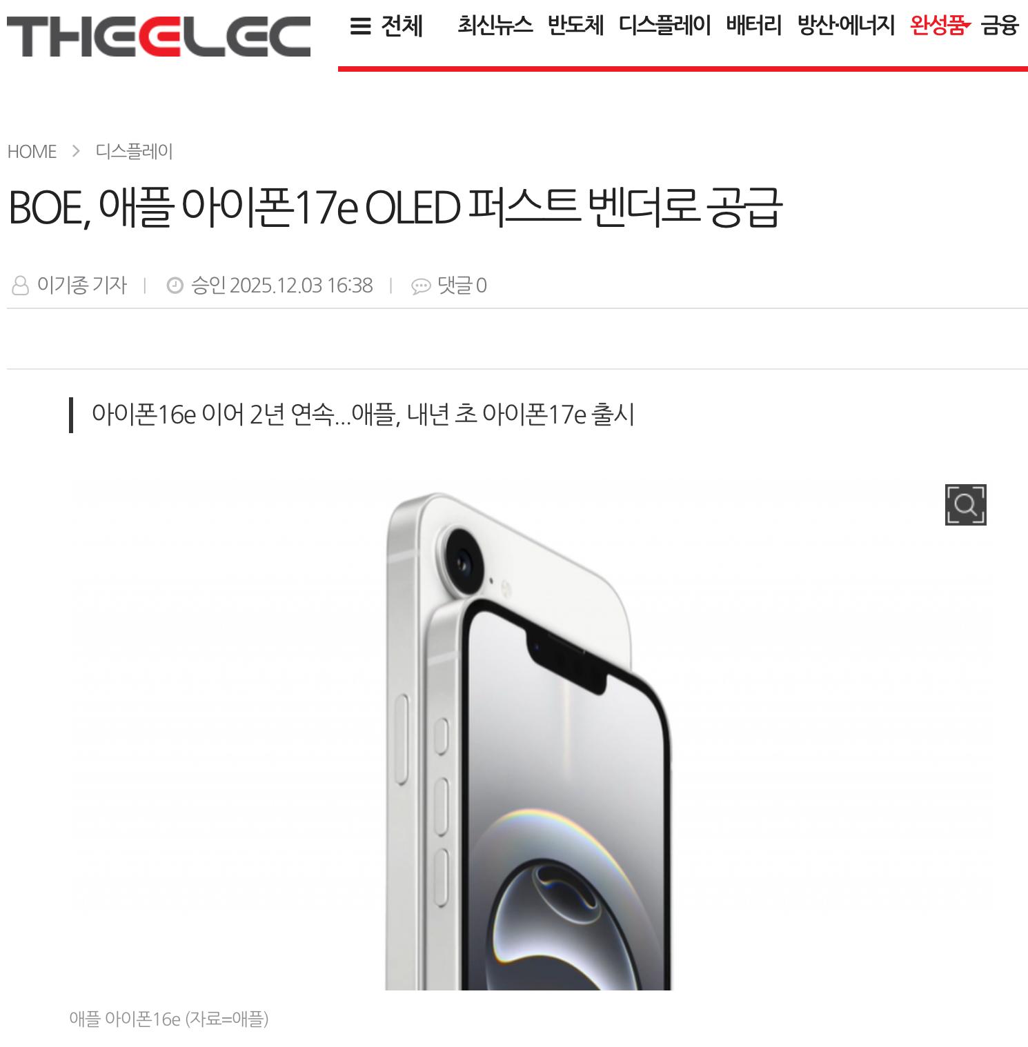 据韩媒 The Elec 报道,iPhone 17e 的 OLED 屏幕仍将由京东方为主供应,三星和 LG 提供部分面板。苹果会使用与 16e 相同的 LTPS 面板,其刷新率维持在 60Hz,尺寸依然是 6.1 英寸。