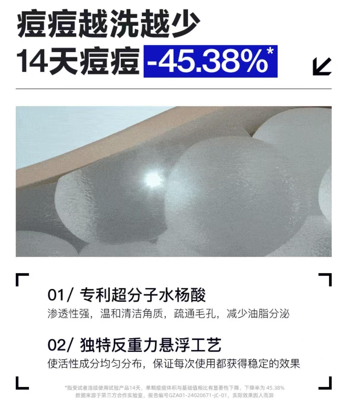 搭配反重力悬浮工艺,让活性成分均匀分布在洁面体系中,每次使用都能保证控油祛痘成分的稳定释放,效果更持久。