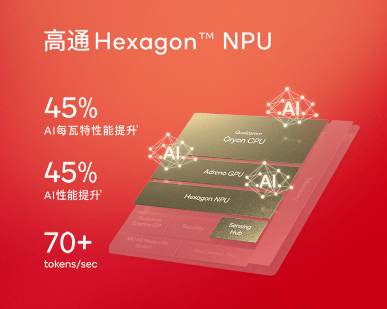 NPU方面,骁龙8至尊版搭载了Hexagon NPU。高通表示,其AI性能提升45%,单位功耗性能提升45%,新增支持端侧多模态AI助手和更快的Token输入。