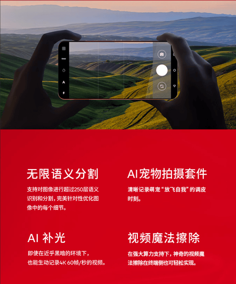 新芯片支持无限语义分割、AI宠物拍摄套件、AI补光和视频魔法擦除等实用功能。