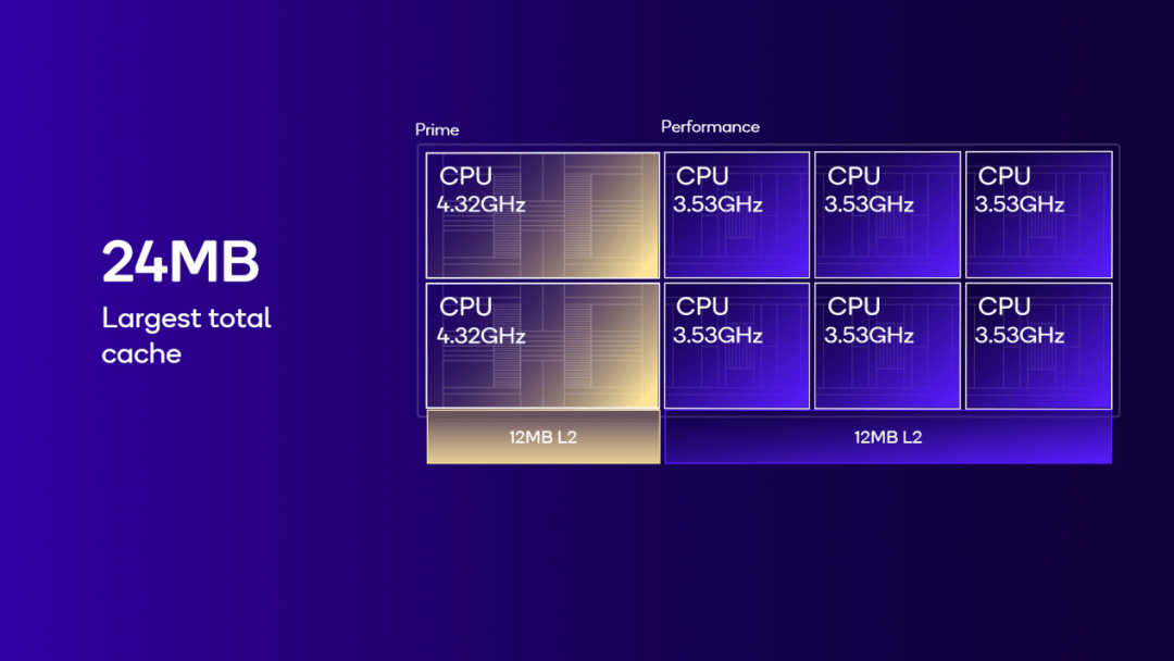 CPU方面,骁龙8至尊版采用第二代定制的高通Oryon CPU,采用2颗超大核+6颗性能核的8核心配置,分别采用12MB L2缓存,超大核的频率可达4.32GHz,相较于上代的骁龙8Gen3有着不小的变化和提升。