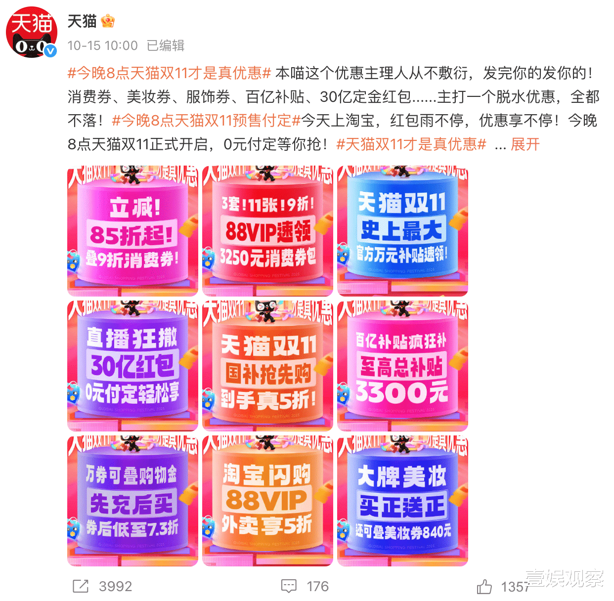 也因此,10月15日淘宝天猫双十一预售,在李佳琦等一众头部主播的连轴转吆喝之下,放大声量去提醒普遍摸不着头脑的消费者。当然,淘天提前了,别的平台更要抢占先机,快手、抖音、小红书、京东也都纷纷以更早的时间开启了双十一马拉松。