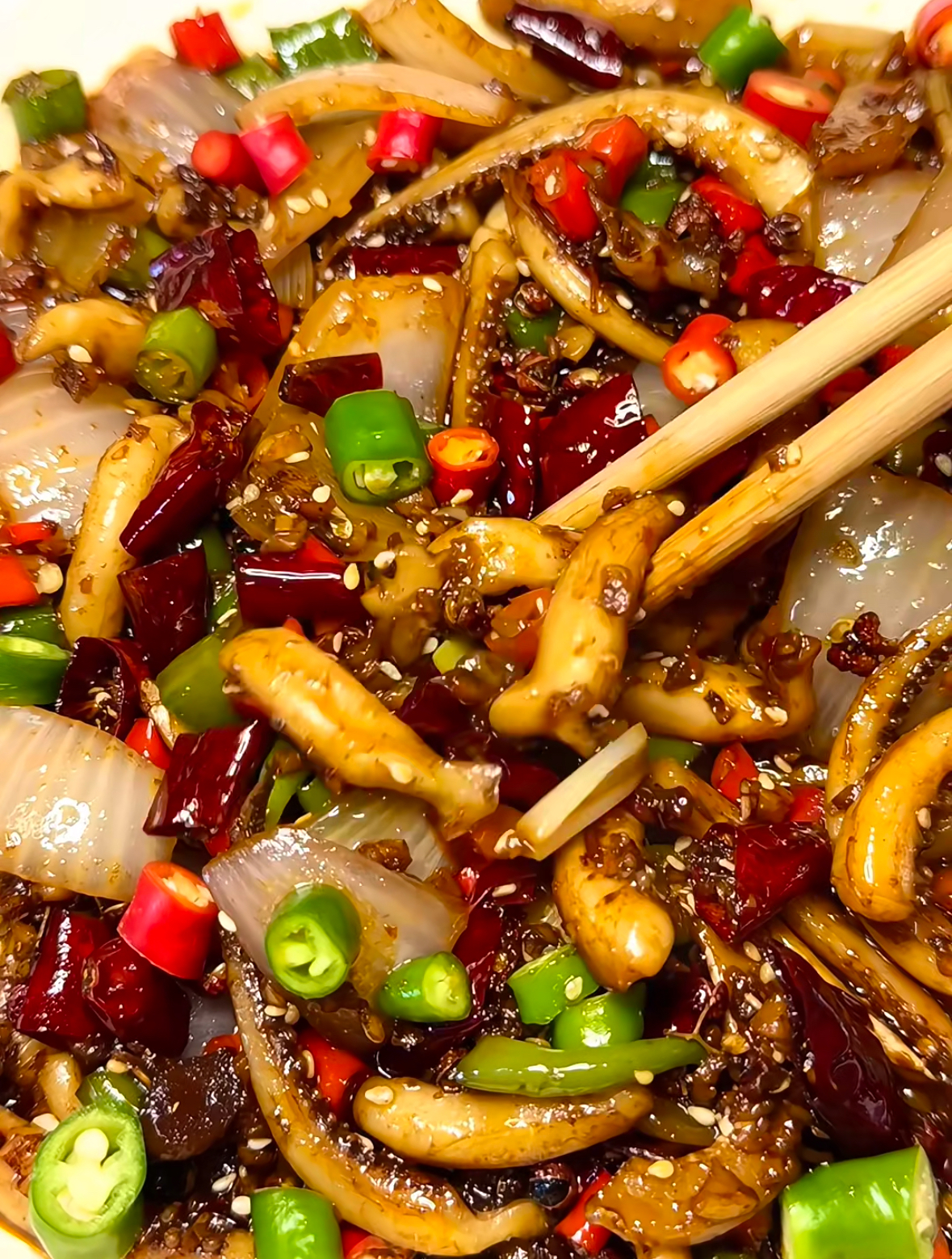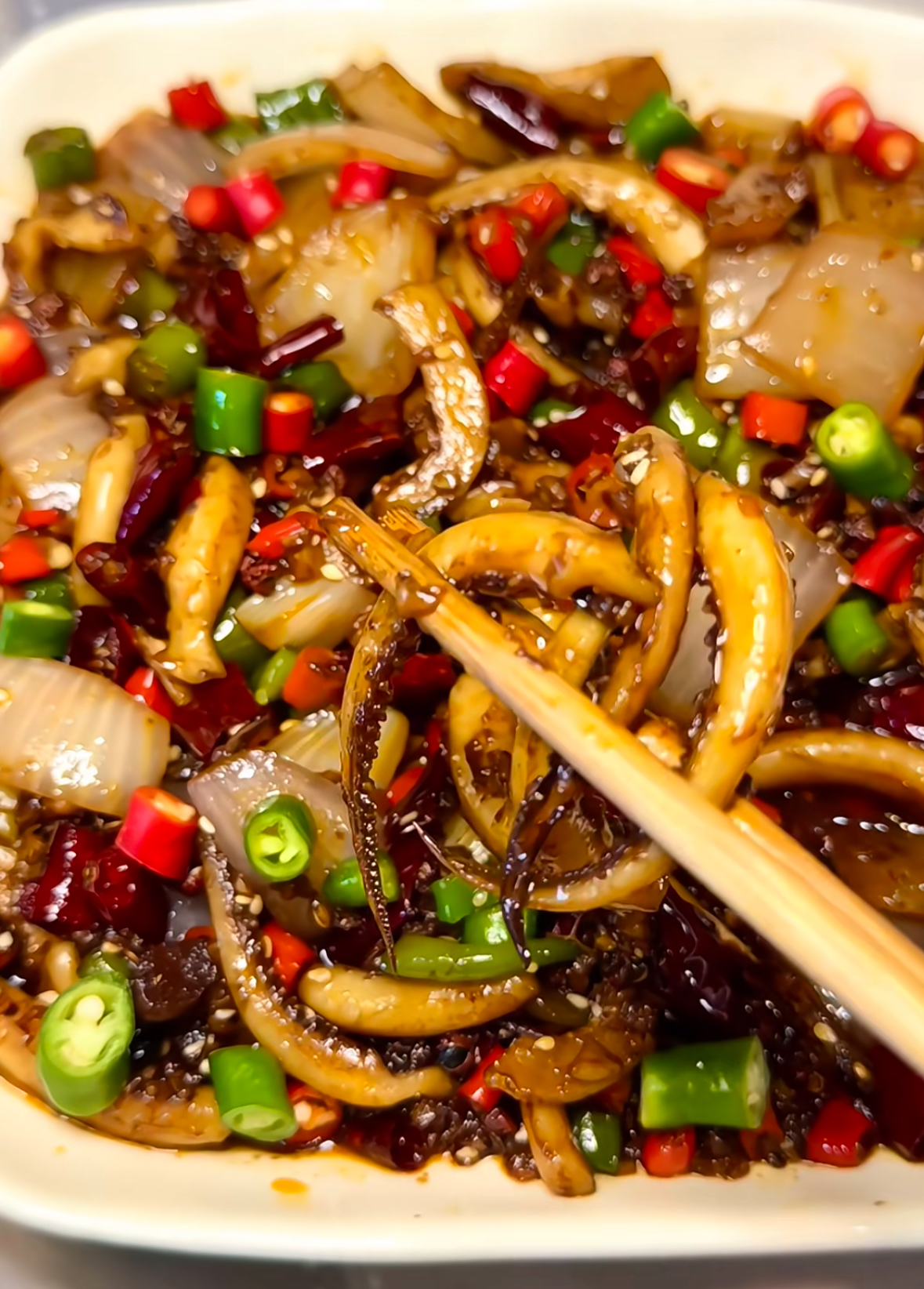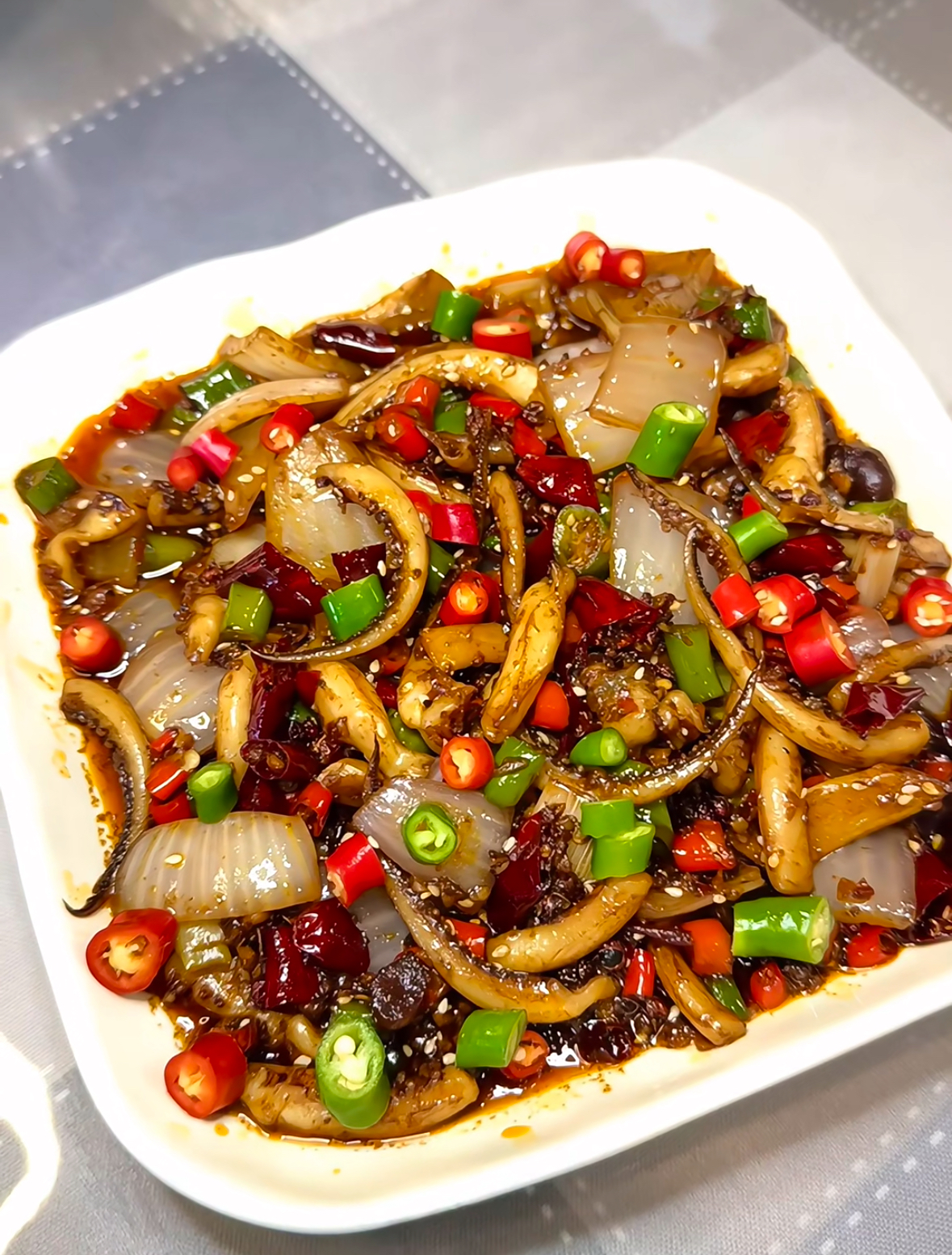 新鲜或水发鱿鱼约500克干辣椒适量(喜辣可多放)姜末、蒜末适量,洋葱、青椒等蔬菜可选,调味料酒1-2汤匙生抽1-2汤匙,豆瓣酱/香辣酱1汤匙,蚝油半汤匙,白糖少许,食用油适量盐香菜段、熟白芝麻适量1. 将鱿鱼清洗干净,去除内脏、表皮薄膜和软骨。可以在鱿鱼内侧打上花刀(斜刀切至2/3深处,再直刀切,注意不要切断),然后切成大小合适的块或条。用少许料酒和姜片腌制一会儿去腥。2. 锅中烧水,水开后放入鱿鱼,焯烫至卷曲变色(约几十秒到1分钟) 立刻捞出沥干。焯水时间不宜过长,否则口感会变老变硬。有些做法会选择将鱿鱼条在六七成热的油中短暂炸1-2分钟,这样口感会更焦香一些。3. 将干辣椒剪成段(用水稍微浸泡一下再捞出,可以防止炒糊且更易出香),姜、蒜切末,洋葱、青椒等配菜切好备用。4. 热锅凉油,油温升高后,依次下入姜蒜末、干辣椒段、豆瓣酱或香辣酱,用小火煸炒出红油和香味。5. 转大火,倒入焯好或炸好的鱿鱼快速翻炒均匀。接着加入洋葱、青椒等耐炒的配菜(如果使用)一同翻炒。6. 沿锅边淋入生抽、蚝油,加入少许白糖提鲜,根据口味酌情加盐(豆瓣酱和生抽已有咸味)。整个过程要保持大火快炒。7. 翻炒均匀,确保鱿鱼和配料都裹上调料后即可关火。出锅前可撒上香菜段和熟白芝麻增香点缀。(根据自己)