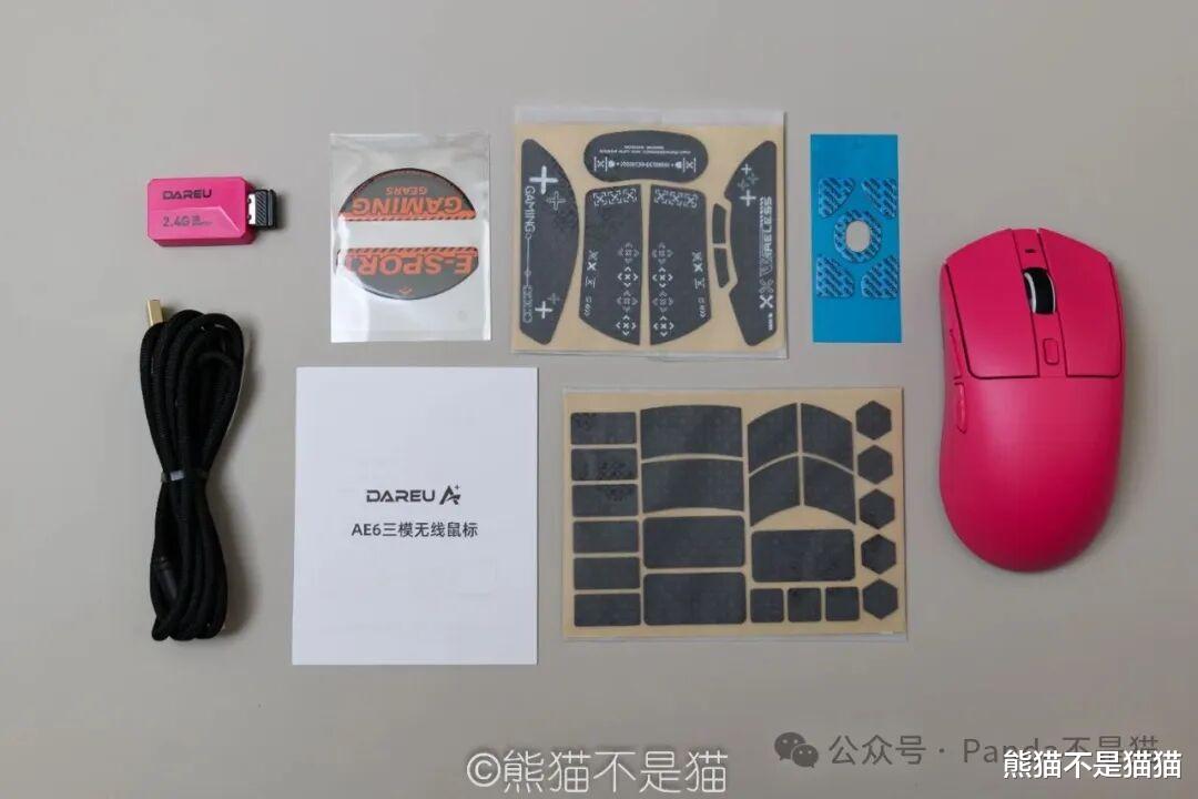 达尔优 AE6 用的是抽屉式包装,这次给出了三种配色。除了经典的黑白配色,还有个特别大胆的洋红色。说实话,外设用这个颜色的真不多,我还是头一回见呢。