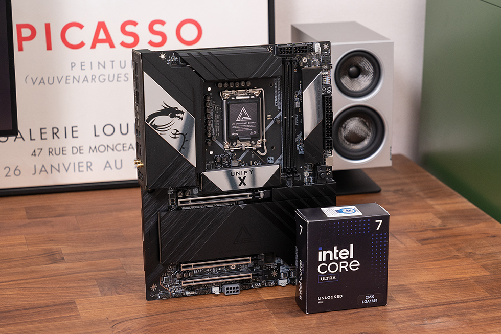 采用酷睿 Ultra 7 265K + 微星MEG Z890 UNIFY-X 主板为核心平台微星MEG Z890 UNIFY-X 主板绝大面积覆盖了铝制散热装甲,拥有旗舰级VRM设计的20+2+1+1 数位供电相数,加上双8pin与110A 智能供电模组,充分释放处理器最佳效能。VRM散热装甲上带有铝合金亮银色散热镜面装饰,并印有黑色的龙形LOGO,通电后装饰镜面边缘可呈现RGB灯效。