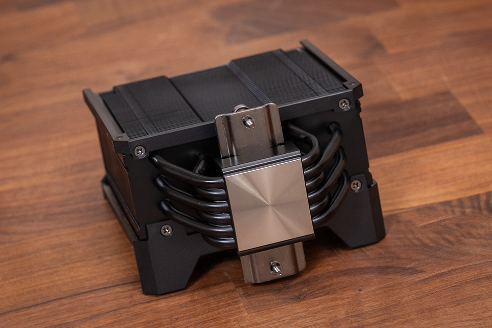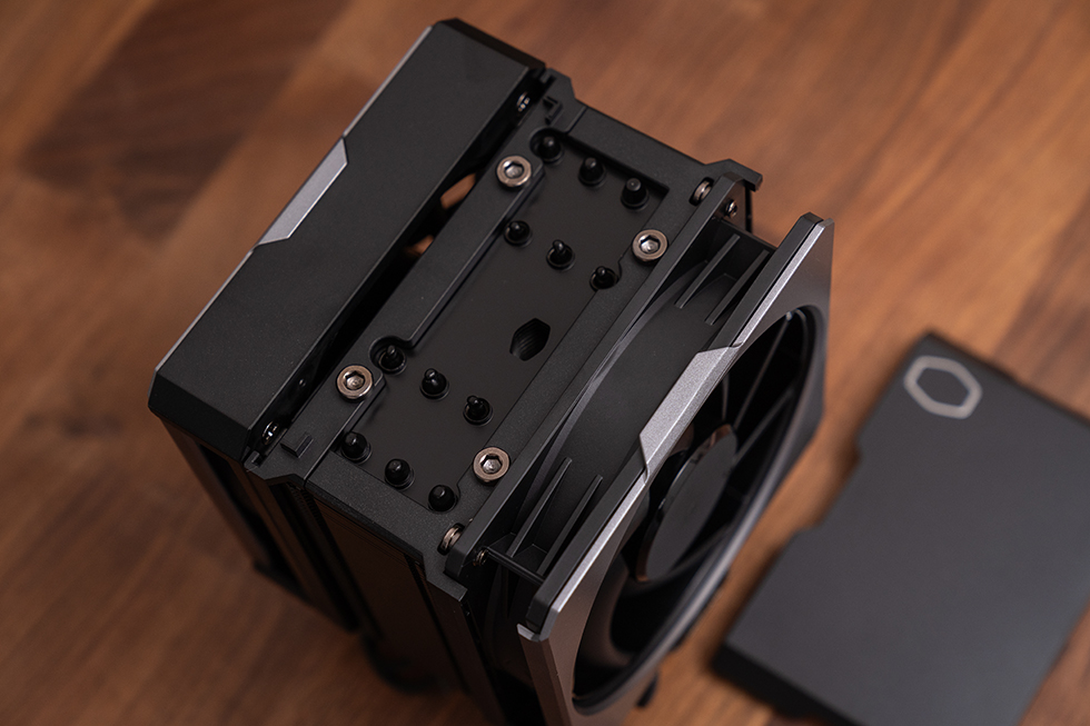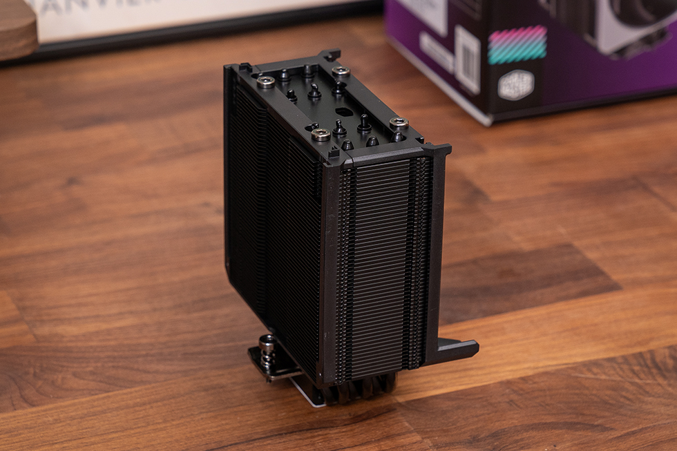 散热器塔体的表面均经过黑化处理,鳍片排布齐密规整,结合双排扣Fin+折Fin工艺实现高效导热;铜底座与六根6mm超导复合热管使用黑化喷油处理,质感细腻光滑,底座和热管的焊接紧实,热管部分还做了偏向避让设计,有效提高内存的安装兼容性。