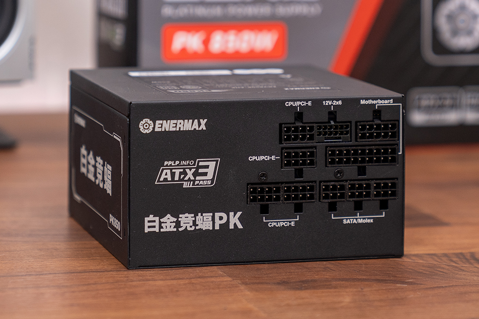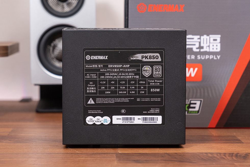 电源来自 安耐美 白金竞蝠PK850W,是一款定位主流消费市场中高端用户的电源,符合 ATX3.1 和 PCle5.1 标准,通过 80PLUS&PPLP 双重白金认证。原厂提供10年质保,体现了大厂对于品质的自信。金属外壳做了涂层,不仅可以增加阻尼方便安装,搭配海景房机箱也比较美观,侧面有厂商和型号的标识,表面为微磨砂质感。斜条纹格栅通过四角螺丝固定在电源顶盖,格栅正中间黏贴有金属材质的安耐美 logo 标牌,浮雕丝印制作、边缘拉丝处理,视觉观感相当高级。