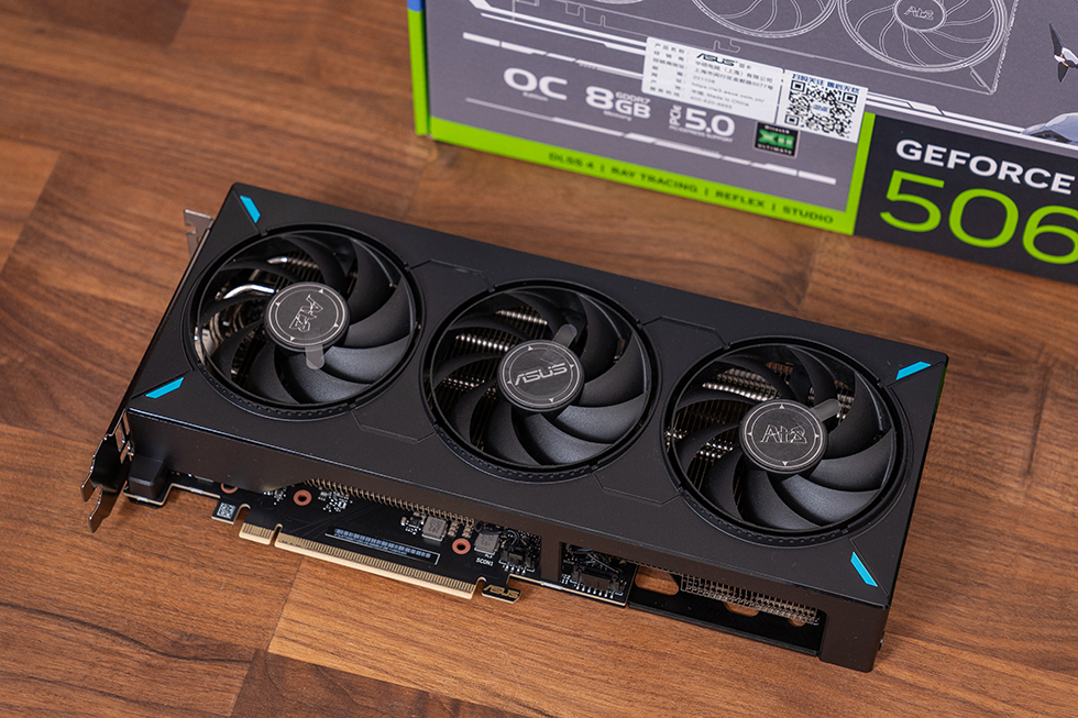 华硕ATS-RTX5060TI-O8G 显卡保持了该系列一贯的简约硬朗设计风格,配备三个强劲的轴流风扇,三个可靠的轴流风扇具备较小的风扇轮毂以使用更长的扇叶,环形密封环可提高向下风压。