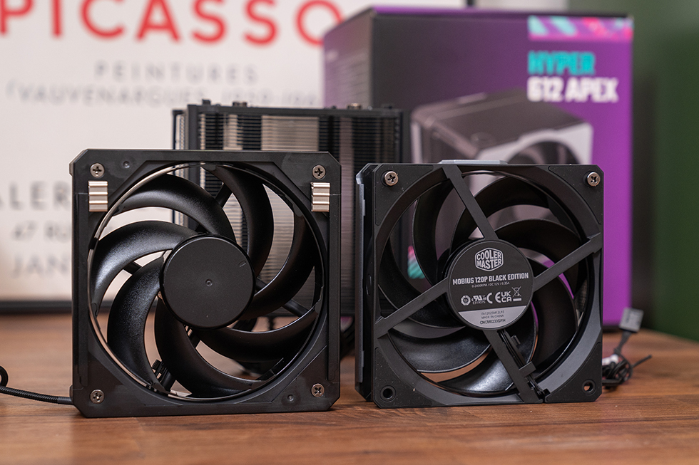 散热采用风冷模式,选用了酷冷至尊的Hyper 612 APEX搭配 莫比乌斯 120 VX风扇。Hyper 612 APEX整体尺寸为127mm x 114mm x 159mm,单塔双扇结构,整体造型简洁方正,遵循“black out”隐形设计美学,标称解热能力 260W。