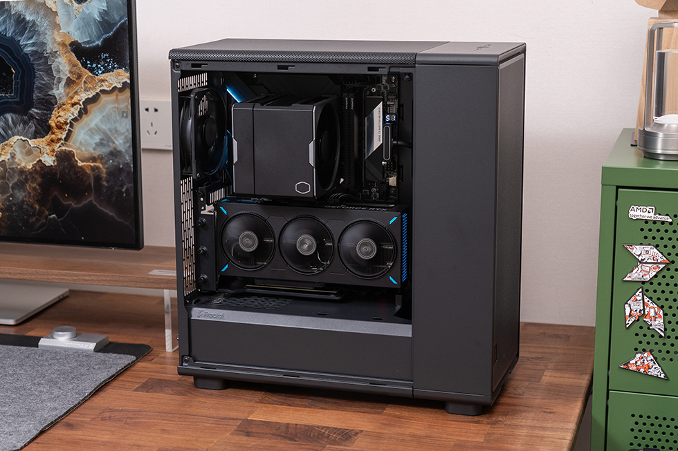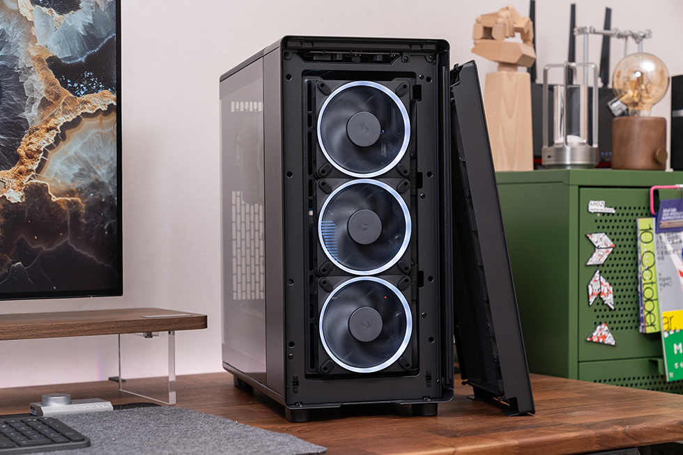 侧板、前面板和顶部面板都可以轻松拆卸,无需螺丝刀等工具,大大节省了装机时间。前板右下方配备激光雕刻的铝制 LOGO 铭牌,为机箱增添了一丝精致感。