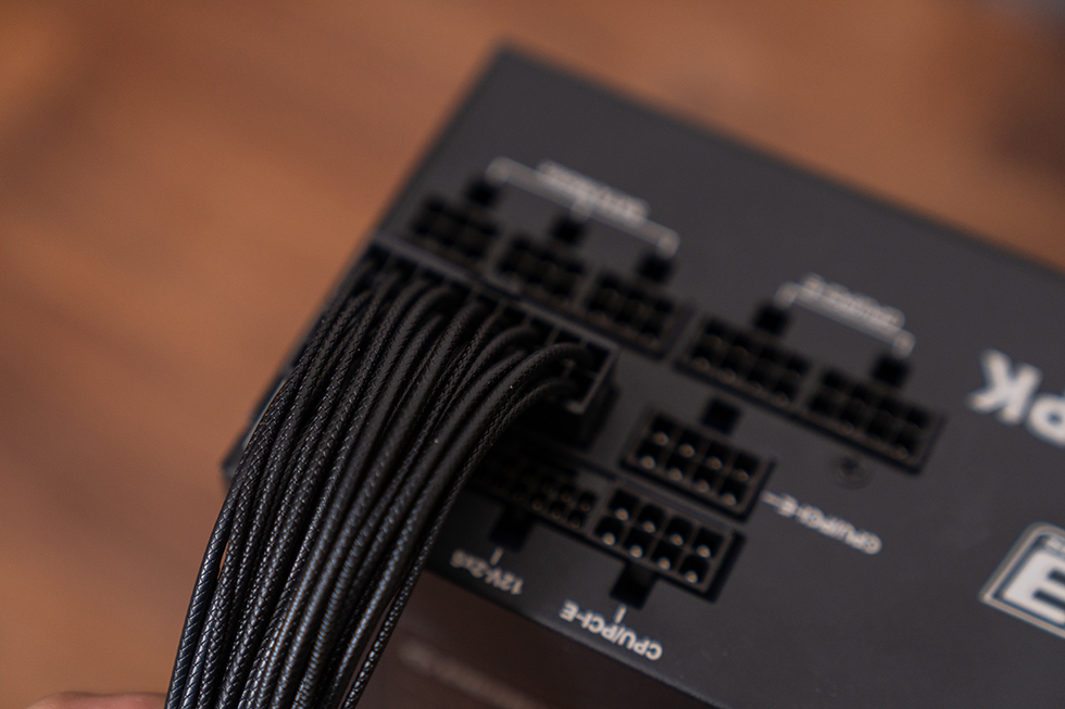 采用全模组设计,提供 4 个 PCIe 和 CPU 接口(可混插),SATA 以及 D 型接口给出了 3 个,还有 1 个 12V-2X6 接口。所有线材都采用压纹模组线,外层经过了压花加工,具有很好的耐磨性和柔软性,远看还有编织网包线的质感,满足装机理线需求。