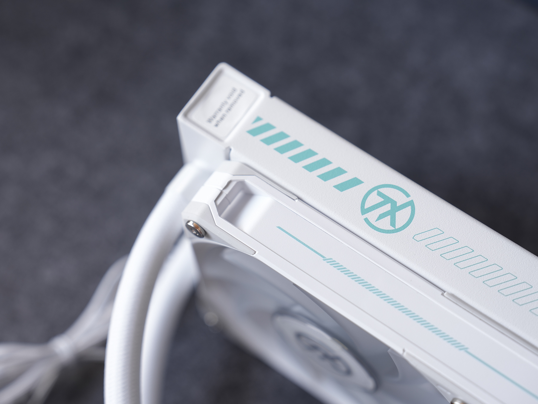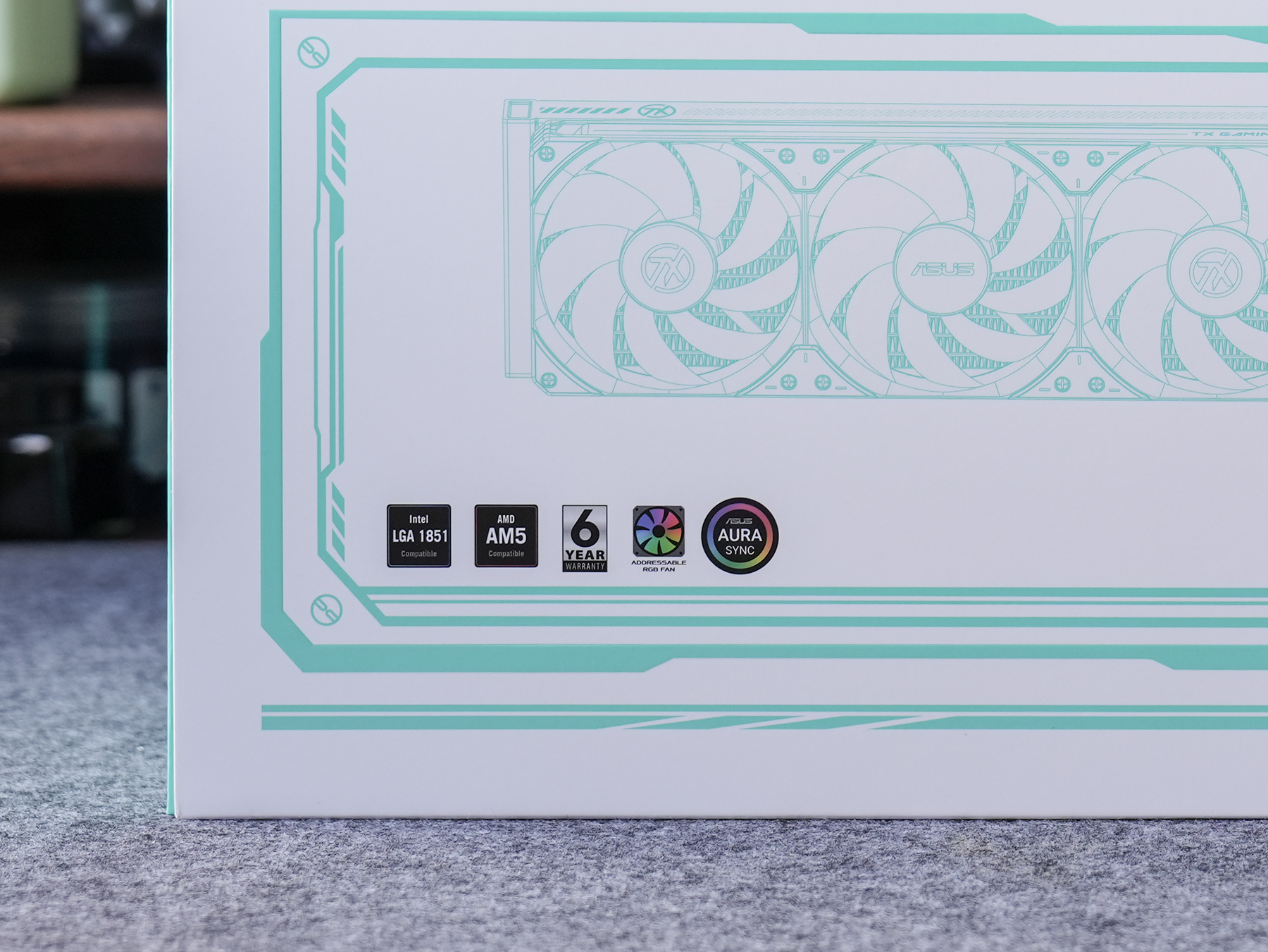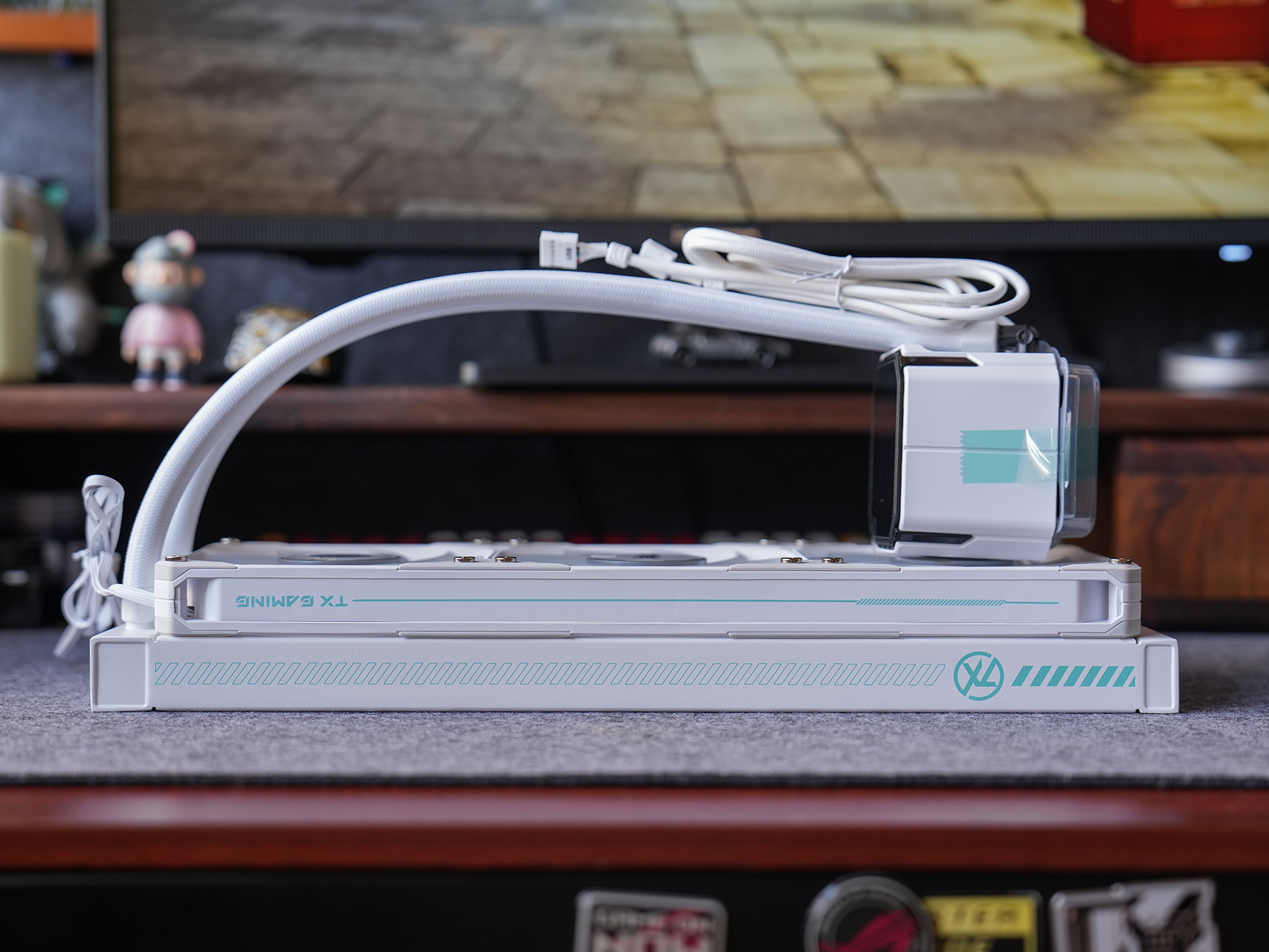 华硕天选这一整条线都是以“大面积的白色辅以小部分的青色”为产品主要配色,这次的华硕天选3代 360一体式水冷也不例外,冷排、水管以及冷头绝大部分都是白色,只有在缓震垫的地方以及一些涂装上用上了青色。