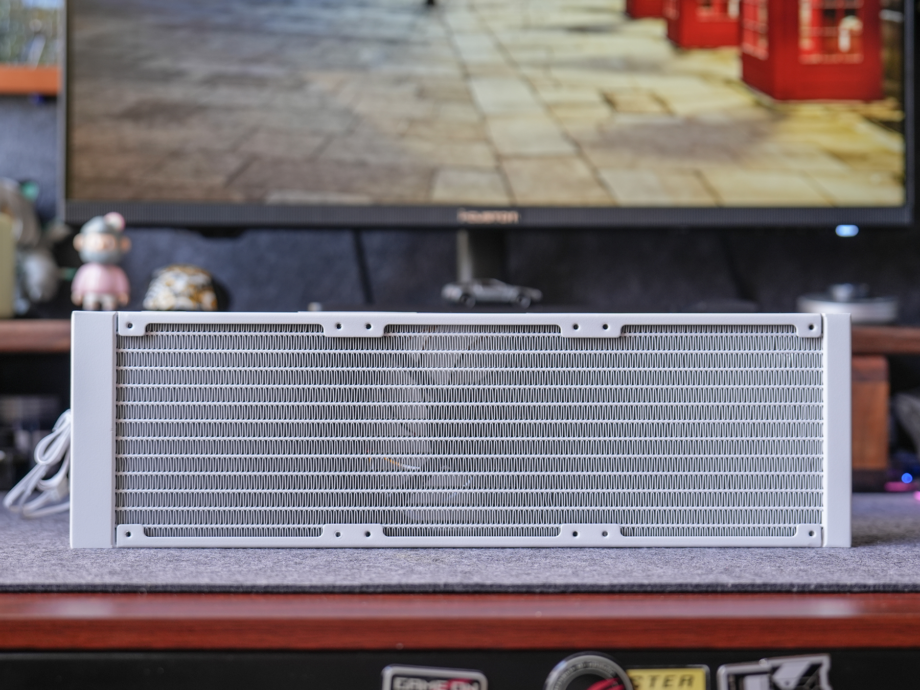 天选3代360一体式水冷的冷排尺寸为394 x 19.6 x 27.2 mm,鳍片采用主流的“Z字型”排列,密度比较大,超大的散热面积可以更快将水道内的热量散发出去。
