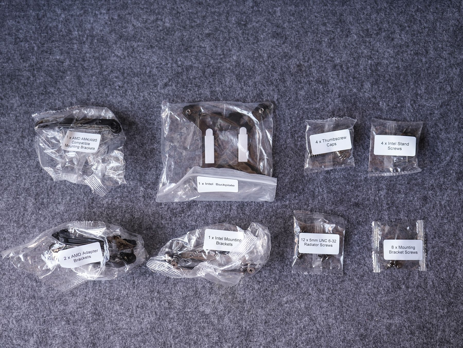 标配的配件比较齐全,包括AMD AM4/AM5和intel LGA1851/1700、1200平台扣具、螺丝包以及一条收纳带。